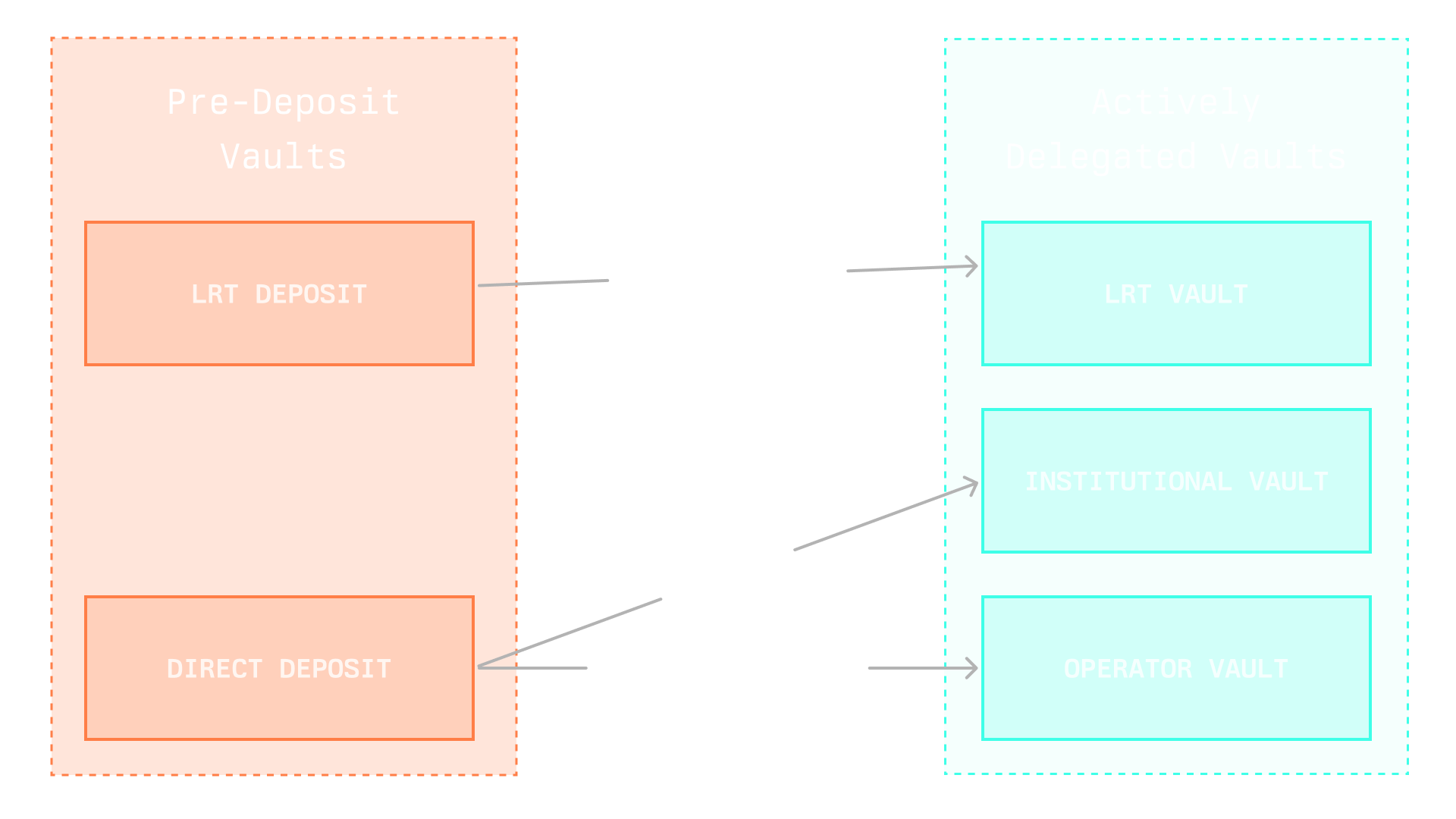 There are two major types of vaults: pre-deposit and actively delegated vaults. Pre-deposit vaults are transitory and designed to preallocate required stake before active delegation.