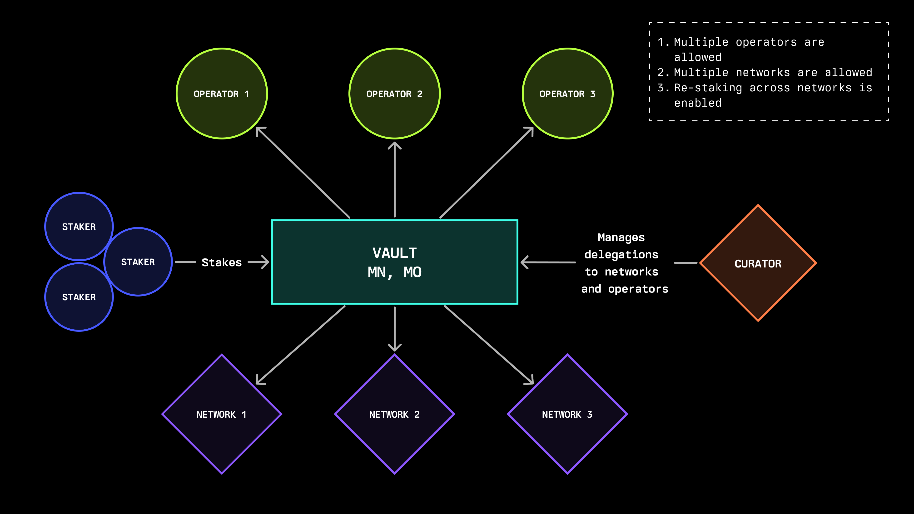 Withdrawal delays represent another key feature in vault design that ensures proper staking conditions, with a single vault capable of simultaneously supporting an extensive list of networks.